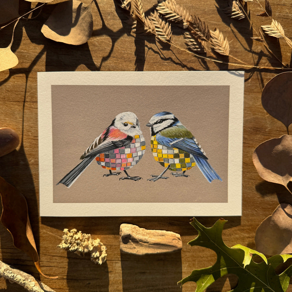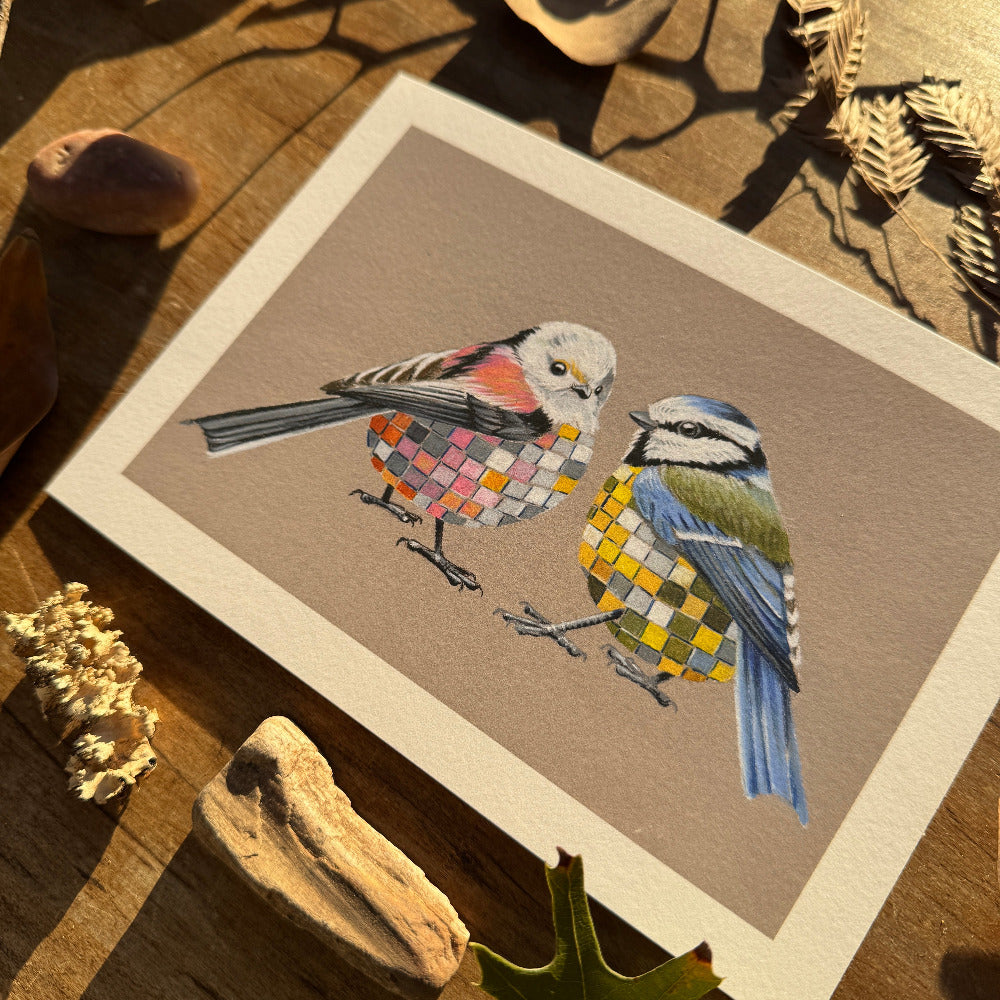 You just interrupted these two tits gossiping, what do you say?? This 7x5" print of two Disco Tits (a long-tailed tit and a blue tit) will brighten up any space.