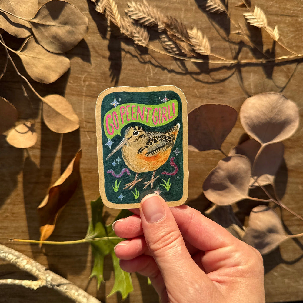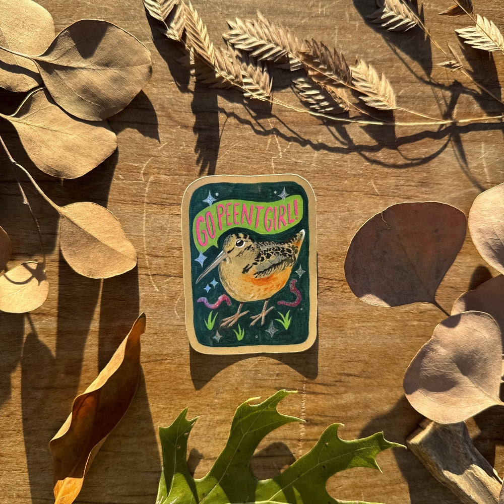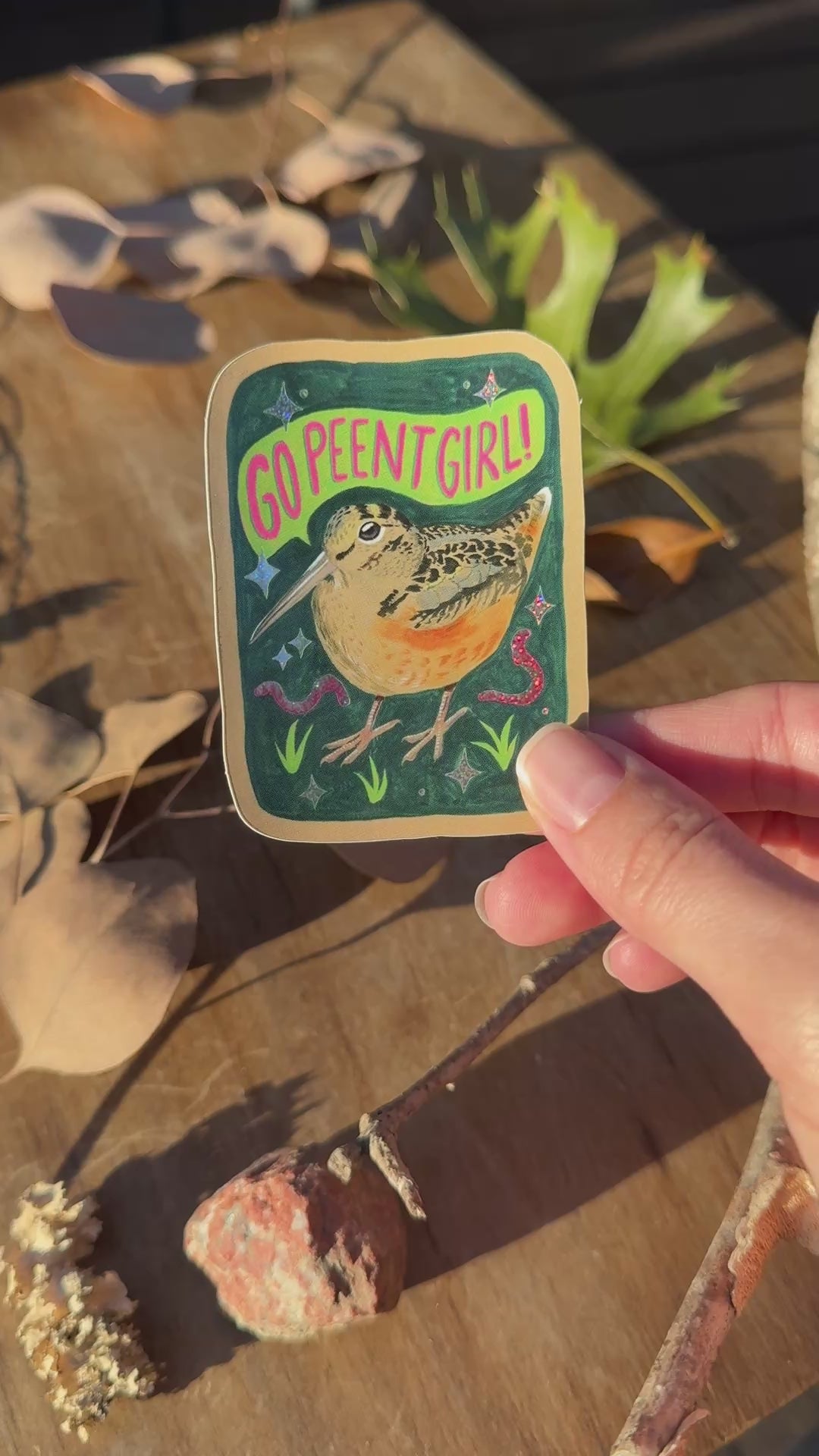 "Go Peent Girl" - this American Woodcock. This stickers measure 2.25x3" and has a glitter effect on the worms and the sparkles. Spark some joy with this goofy sticker for the bird nerd in your life!