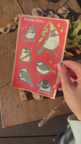 Ahhh ye olde medieval birbs! Back when chickadees were little knights and rogues and paladins and princesses! With this subtly shiny sticker sheet you can appreciate ye olde birbs anytime in the modern day. This 4.5ish x 7" sticker sheet truly has it all!