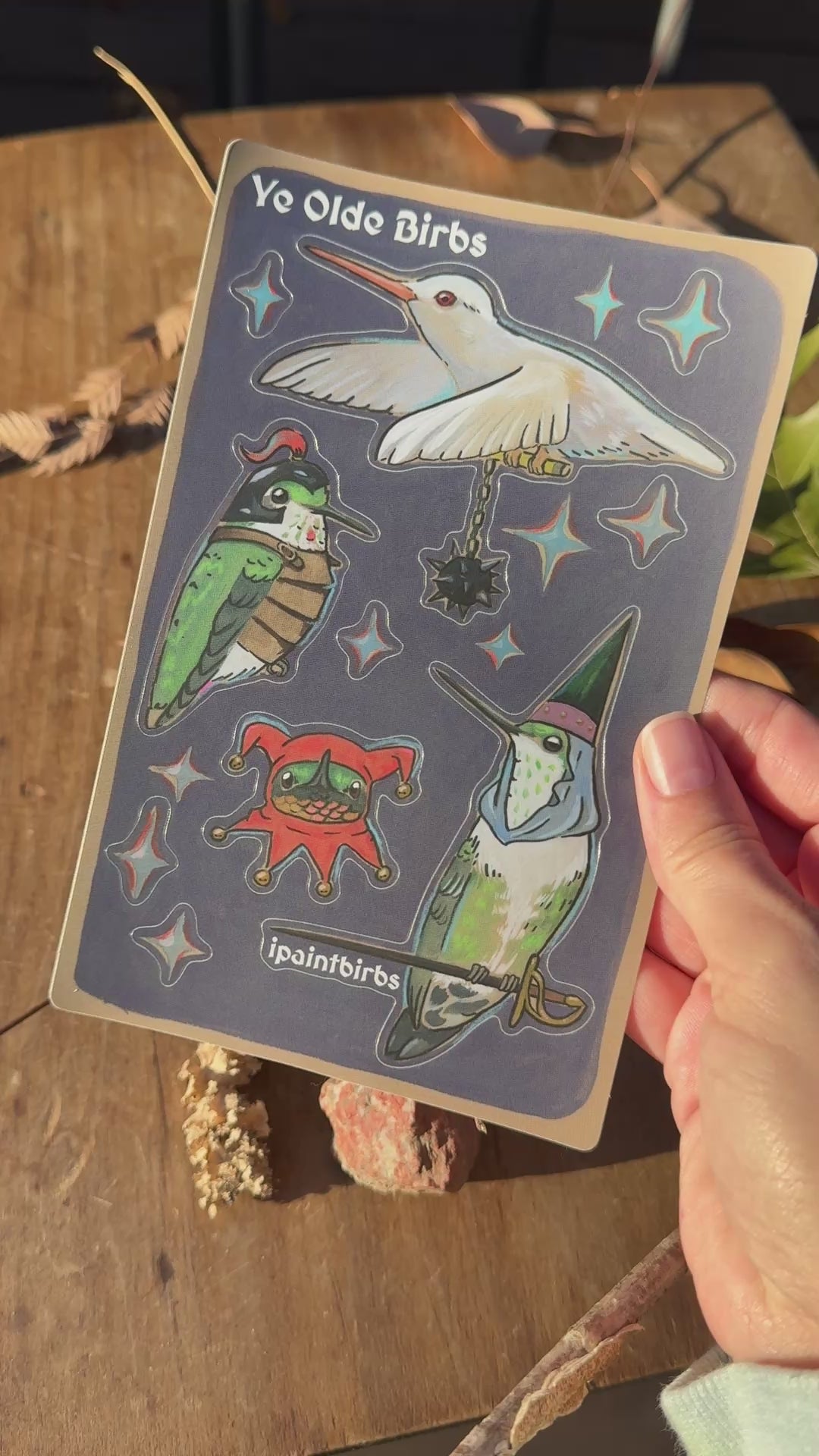 Ahhh ye olde medieval birbs! Back when hummingbirds were little knights and rogues and paladins and princesses! With this subtly shiny sticker sheet you can appreciate ye olde birbs anytime in the modern day. This 4.5ish x 7" sticker sheet truly has it all!